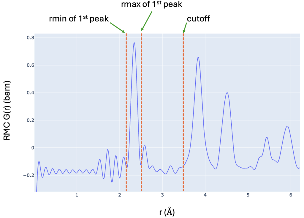 6. For the parameters in the very last line, refer to the following figure for the meaning of ‘cutoff’, ‘rmin of 1st peak’ and ‘rmax of 1st peak’,